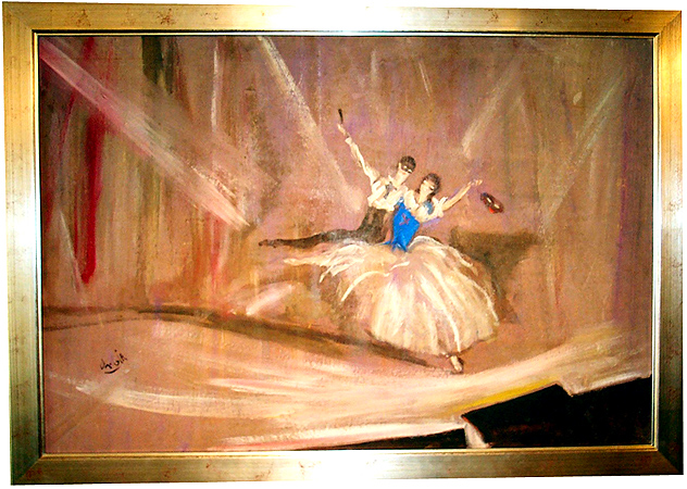 This painting by Charles Felix Gir (French 1883 - 1941) is a large oil on board showing a ballet duo, she is holding her mask and together under the lights, they dance on. The painting measures 26" x 37" and is in a silver leaf frame.