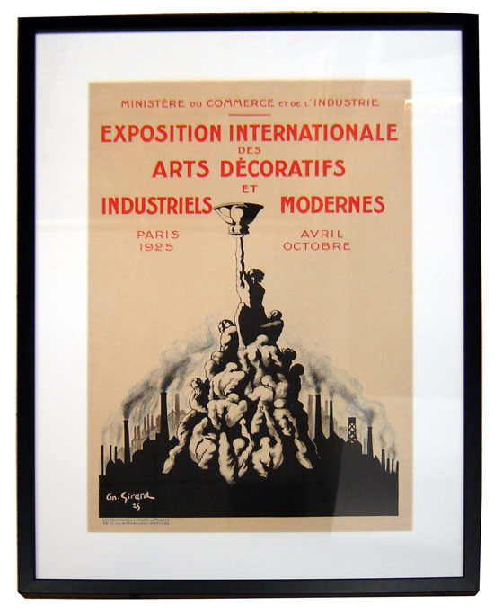 The rarest and probably most striking of the 1925 Paris “Exposition Internationale des Arts Decoratifs et Industriels Modernes” posters. Designed by Andre Girard (1901 – 1968), the poster shows a mass of humanity rising pyramid- like toward a chalice. Factories and smokestacks form a second pyramid in the background. Like the 1925 Expo Posters by Bonfils, Loupot and Bourdelle, this poster measures 23” x 13”.