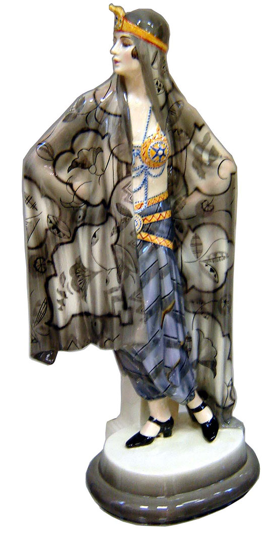 This Austrian art deco ceramic lady was sculpted by Josef Lorenzl (1892 – 1950) in the 1920’s for the firm Friedrich Goldscheider. The statue was originally molded as a lamp base and could be wired for that purpose or stand alone as a great deco figurine. The tall (17”) lady is signed “Lorenzl” and stamped on the bottom “Hand Decorated, Goldscheider, Wien, Made in Austria”. Also impressed on the base “5281”, “802” and “6”.