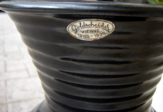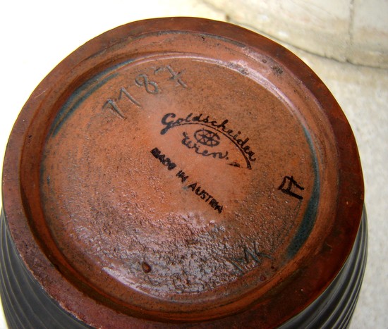 This monumental Austrian art deco vase was created in 1935 in celebration of Goldscheider’s 50th Anniversary. The handsome vase is of terracotta with a metallic black glaze. The ribbed vase with bulbous middle, narrow neck and flaring top measures 19” high and is 8 ½” wide at the middle. On the top lip is a silver tag reading “Goldscheider, Vienne, 1885 – 1935”. The base is marked “Goldscheider, Wien” with their cipher and “Made in Austria”. The base is incised “1187” and “MK”. There is also an underglaze mark “A”.