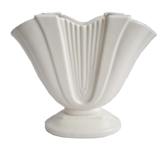 This American art deco white ceramic gladiola vase was made by Hagar Pottery ca. 1940. It has a sweeping fan form on an oval base. There are two straps across the top opening to keep the flowers from bunching. The vase is marked "Hager USA" with a blue stamp on the bottom. It is 12 ½" high and is 14 ½" wide.