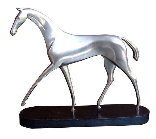 This Austrian art deco silver bronze horse sculpture was designed by Karl Hagenauer in the 1930’s. Striding on itls oval ebonized wood base the horse is a study in frozen motion. The sculpture is 10 ¾” high and 13” long. The bottom is stamped wHw (Hagenauer Werkstat Wien).