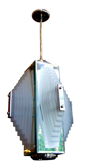 This American art deco hanging light from a Palm Beach Estate features a nickel shaft, ceiling cap and a four step fitting with a beveled mirror rectangular body and four eight stepped frosted glass panels, each secured by a nickel plate and each internally illuminated. The bottom has a 75 Watt light shining downward with a nickel ring. The fixture measures 38” tall and 17” wide (which can be shortened by shortening the shaft). A spectacular light for an entrance way or staircase.