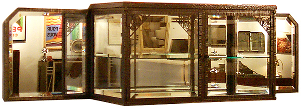 This French art deco hanging vitrine features fine hand wrought iron work, a beveled mirror back, beveled glass sides and doors and two "wing" beveled glass mirrors. There is a glass shelf and a glass bottom. Dating from the 1920's the unit measures 63 1/2" wide, 18" high and projects 17" from the wall.