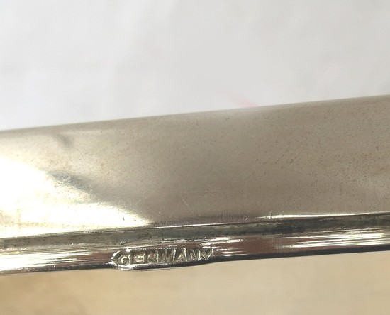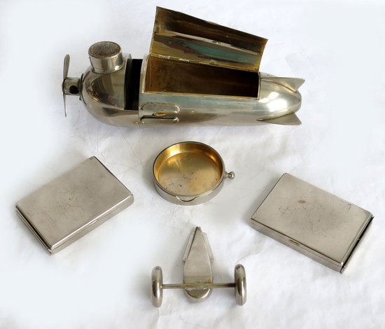 This very rare German art deco smoker’s companion in the form of an airplane was designed ca. 1930 for J.A. Henckels, Solingen, Germany. The airplane includes a hinged compartment in the center for cigars, two removable cigarette cases as wings, a set of four ashtrays behind the match safe with striker that is the cockpit. The propeller is spring loaded as a cigar clipper which drops the cutting into the wheel carriage. It is stamped “Germany”. The airplane 9 ¾” long, 5” high and the wing span is 10 ½”.