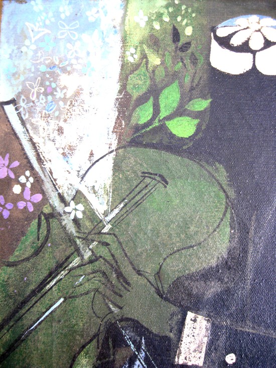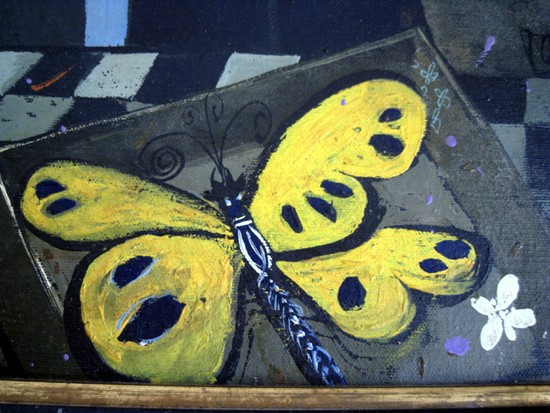 This oil on canvas painting is by Henry Lawrence Faulkner (1924 – 1981). The painting of a headless violinist with a butterfly was done after a famous 1976 weekend party in Liberty, Kentucky which Henry attended. Linda wanted her friends to visit her but Liberty was out of the way. She said "You all would come to my funeral…" So she had a funeral, complete with rented coffin. At the beginning of the party, a butterfly landed on her shoulder and stayed there for the weekend. Henry painted butterflies in his paintings for a period after the party. The painting is 18" x 12" and is in a black frame which is 20" x 14" overall.