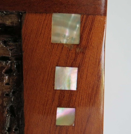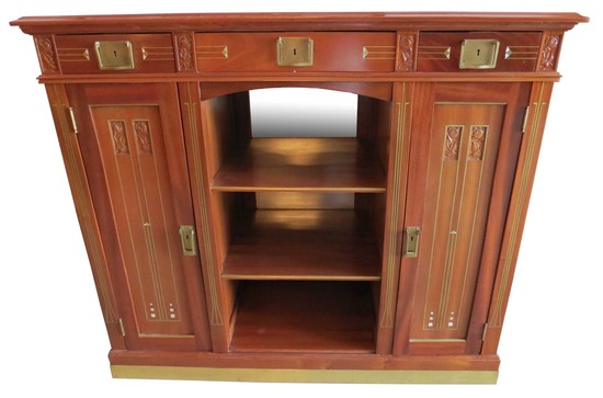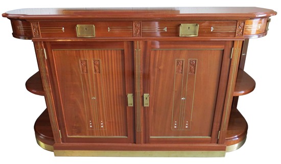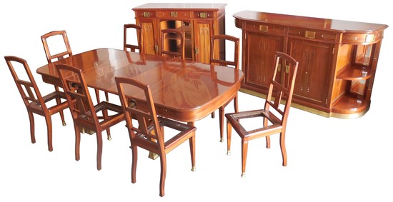 An important Belgian art nouveau dining set attributed to Henry Van De Velde (1863-1957). The set consists of a dining table with three leaves, eight chairs, a buffet and a sideboard. This magnificently crafted solid mahogany set features hand carved roses on drawers, doors, chair back plates, and the table apron. Vertical brass stringing and inlaid mother of pearl details all add a unified sense of rich elegance. There are bronze kickplates on the buffet and server and bronze sabots on the table and the front legs of the chairs. The table is 43” wide by 53 1/2” long (91 1/2” long with the three leaves) and 30” high. The buffet is 79” long, 23 1.2” deep and 43” high and the server is 55” long 21” deep and 471/2” high. The set has been professionally restored and is in impeccable condition and only awaits your choice of fabric for the chairs.