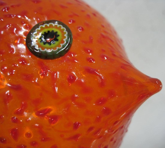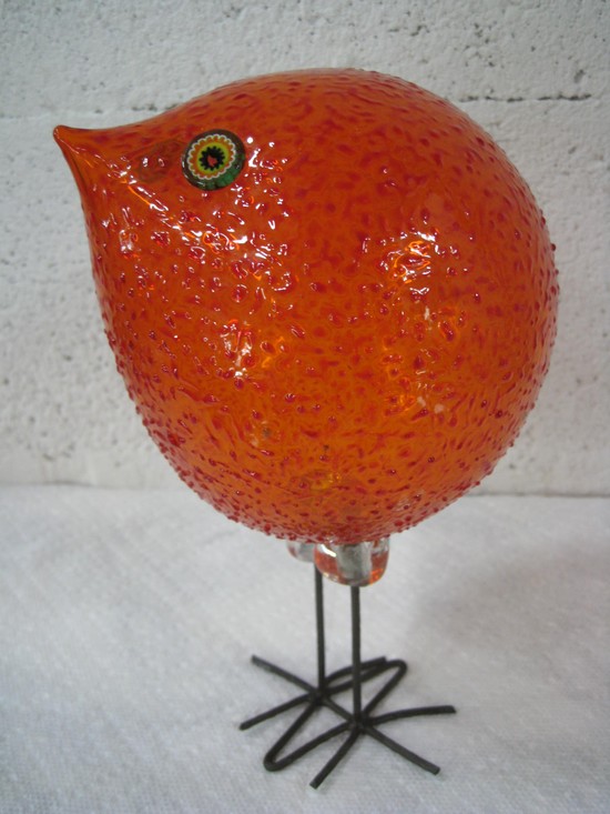 This cute orange glass bird PULCINO was created in 1963 by Alessandro Pianon (1931 - 1984) for the Italian Murano glass firm, Vetreria Vistosi and numbered model 193 in their catalog. The bird has a textured glass body, clear glass thighs, copper legs and Millefiiore eyes. He measures 5 ½” x 4 ¾” and stands 9” tall.