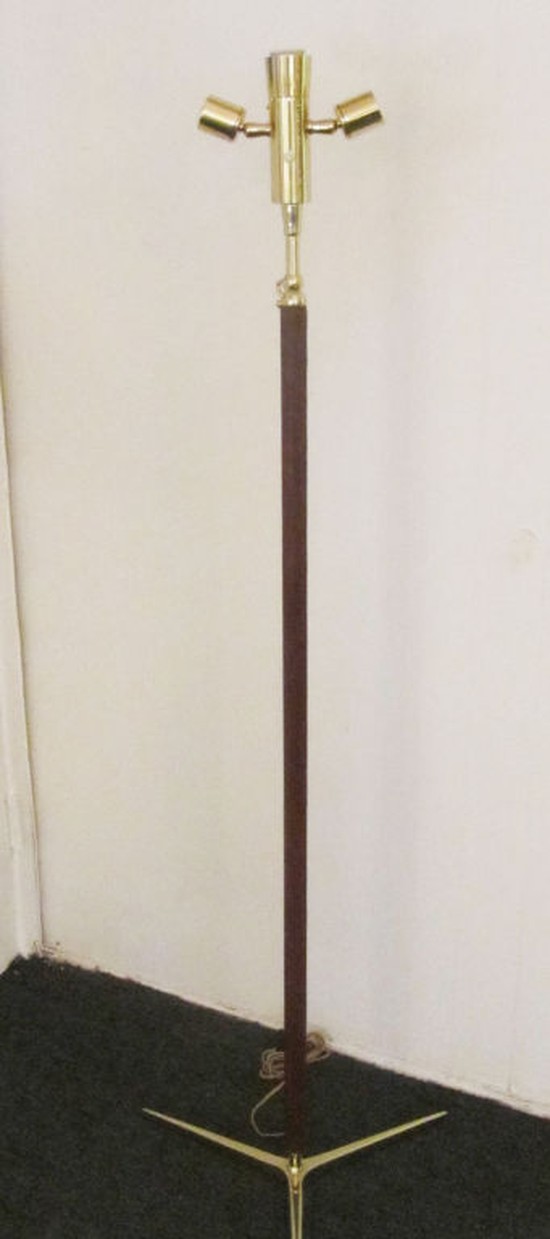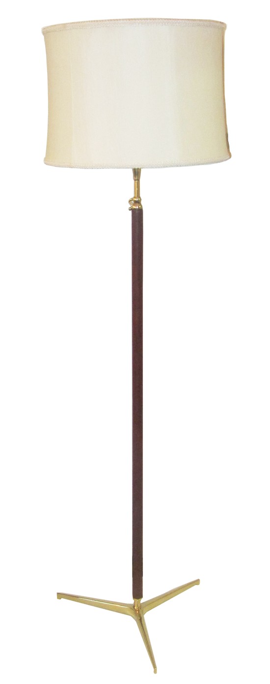 Jacques Adnet (1900 - 1984) designed this beautiful and useful floor lamp shortly after World War II. The adjustable brass shaft sits on three brass feet and is wrapped in saddle stitched blood red leather. The height of the lamp is adjustable from 60” to 79”. A new custom made “No Shadows” silk shade has been installed. The fixture takes three bulbs: a 100 to 300 watt in the center and two round 60-watt bulbs on either side. The lamp has been rewired for American electricity and is in excellent condition.