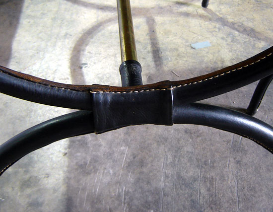 This rare matching desk and chair by Jacques Adnet (1901 – 1984) dates to ca. 1950. The brass frame is painted black on the legs and leather wrapped on the upper portions. Pulls, trim, sabots and the center rail are all in exposed brass. The top is composition. In overall good original condition, the desk measures 43 ¾” wide, 22 ¼” deep and 29 ½” high. The chair measures 23” wide, 20” deep, 31” high with the seat being 17” high. A similar desk and chair ensemble is pictured in Anne Bony, Les Annees 40, Paris, 1985. p. 441, and Bruno Fourcat and Jean-Louis Gaillemin, Les Décorateurs des Annees 40, Paris, 1998. p. 73.