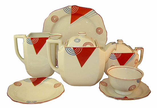 This Japanese art deco tea set is from the 1930’s and is by the pottery manufacturer Moriyama. The set is hand painted in a geometric deco design in red and blue on white. It consists of a teapot, covered sugar, creamer, serving cake plate, four cake plates, four tea cups and four saucers. The pieces are marked on the bottom with the Moriyama mark and “Japan”.