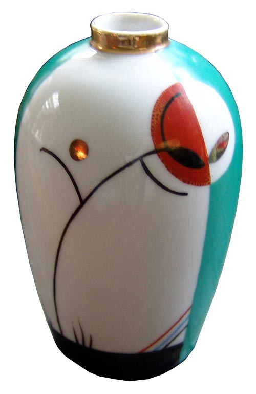 A fine Japanese art deco porcelain vase. Only 3 ½” high the handpainted vase is decorated with a simple design in red and black on a white and green ground. Marked on the bottom “Meito China”, “Hand Painted” and “Made in Japan”.
