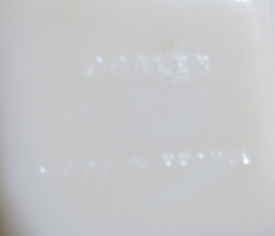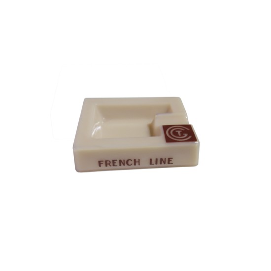 Jean Luce (1895-1964) designed this ashtray for the SS Normandie ca. 1930. The owners of the Normandie, Compagnie Generale Transatlantic, first had the ship’s name on the ashtray, but they disappeared into purses and pockets as souvenirs, they had the name over painted. A third version replaced the name “Normandie” with “French Line”. This version is of tan glass, it has the CGT emblem on top, “French Line” on one side and “Cie Gle Transatlantic” on the other. It is molded on the base “opalex” and “Made in France”. The ashtray is 3 ¼” by 2 ¾”. It is in excellent condition.