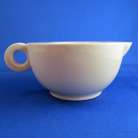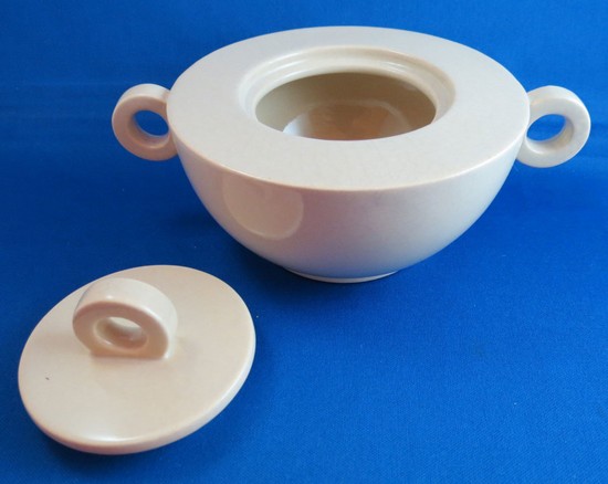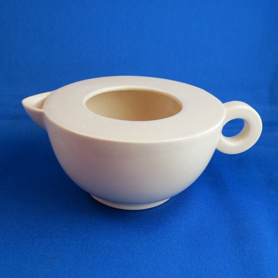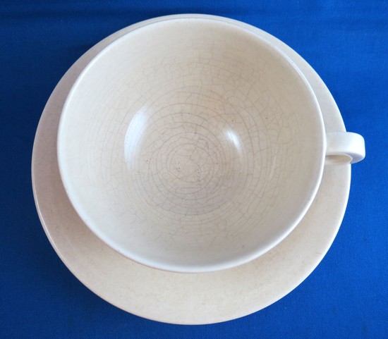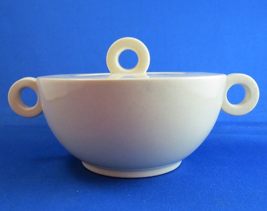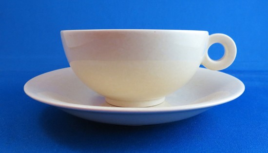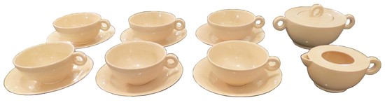 This French art deco fourteen piece porcelain coffee service for six was designed by modernist Jean Luce (1895-1965). The ring handles and finial of the sugar and creamer are repeated on the cups. Each piece is marked with Luce’s cipher. There are no chips or cracks; the cups have crazing on the interior as is usual.