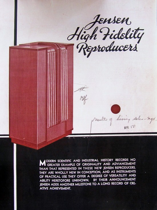 Peter L. Jensen of the Jensen Radio Manufacturing Company, 6601 South Laramie Avenue, Chicago, Illinois, introduced the Jensen Imperial Reproducer in 1929, calling it “the concert grand of reproducers”. This American art deco version was featured on the cover of the company’s 1936 Catalog of Jensen High Fidelity Reproducers. The speaker is in black lacquer with eight vertical maple bars and two metallic painted gold bars that end at the control panel on top. Inside the control panel a decal reads “Jensen Imperial Reproducer”. It is also marked “Model D” and serial number “A-7033”. A red “jewel” light on the bottom shows when the speaker is turned on. The speaker is 46 ½” high, 27 ¾” wide and is 18 ½” deep.