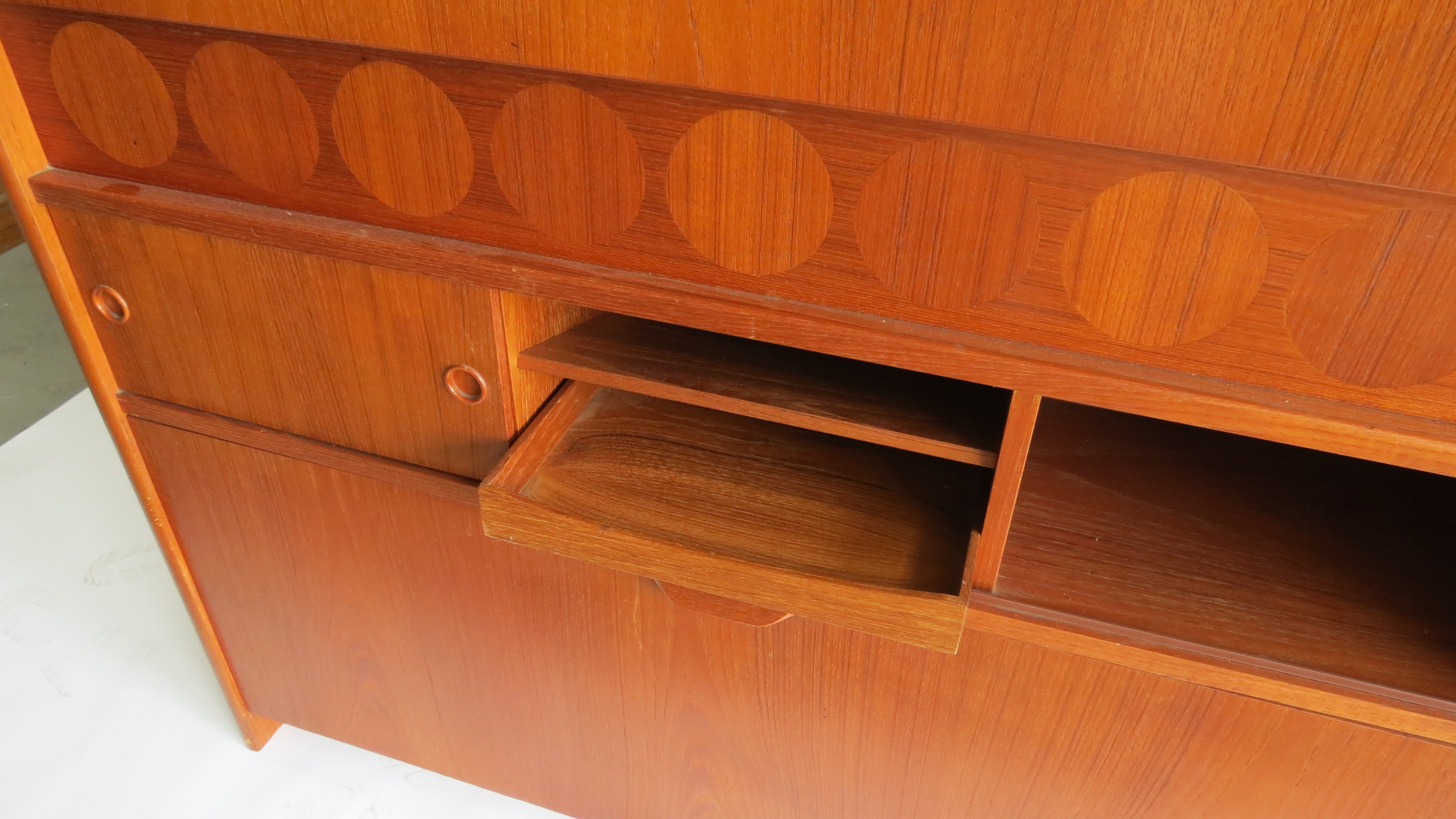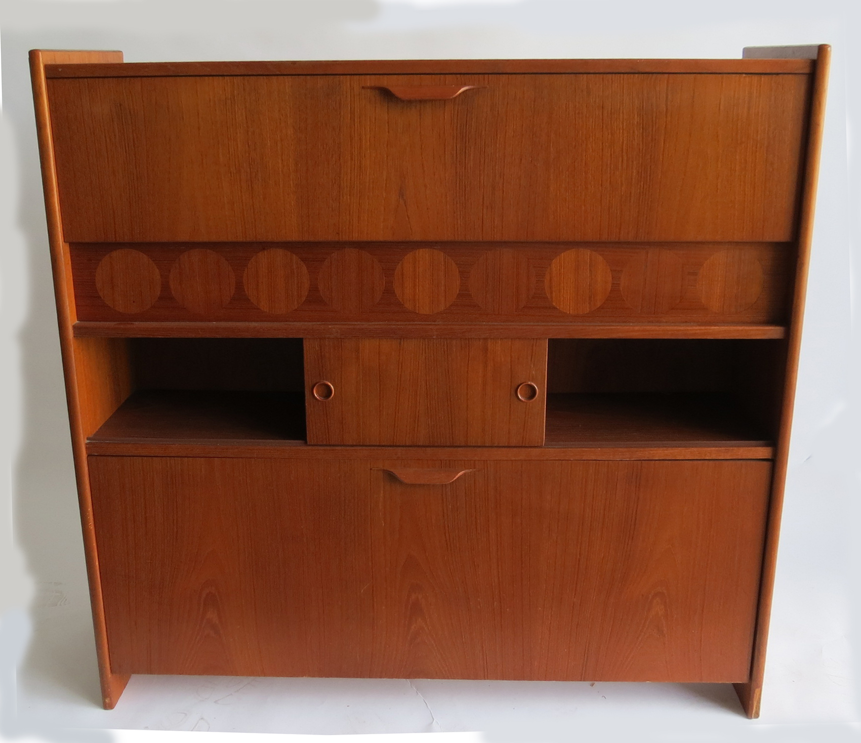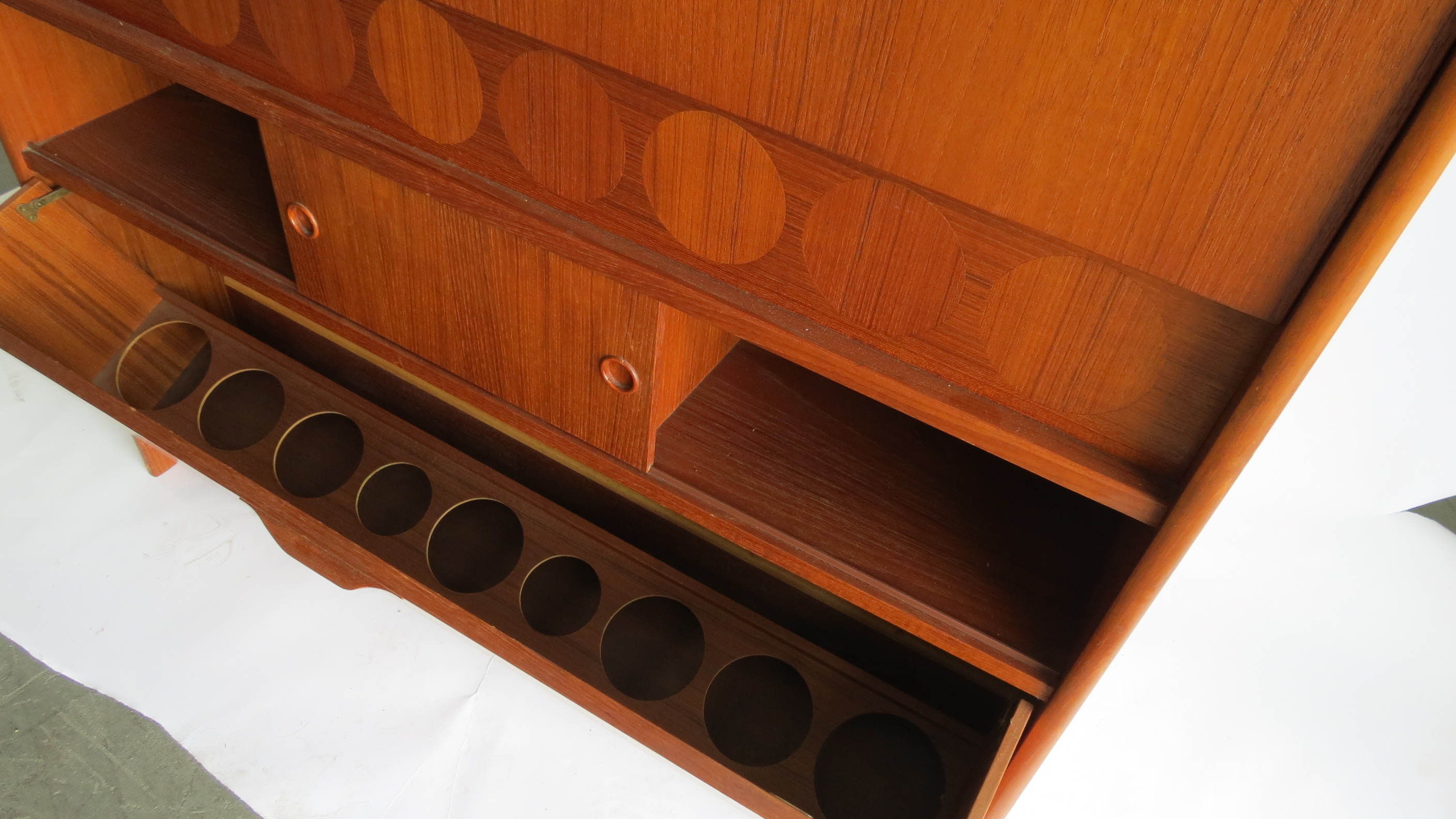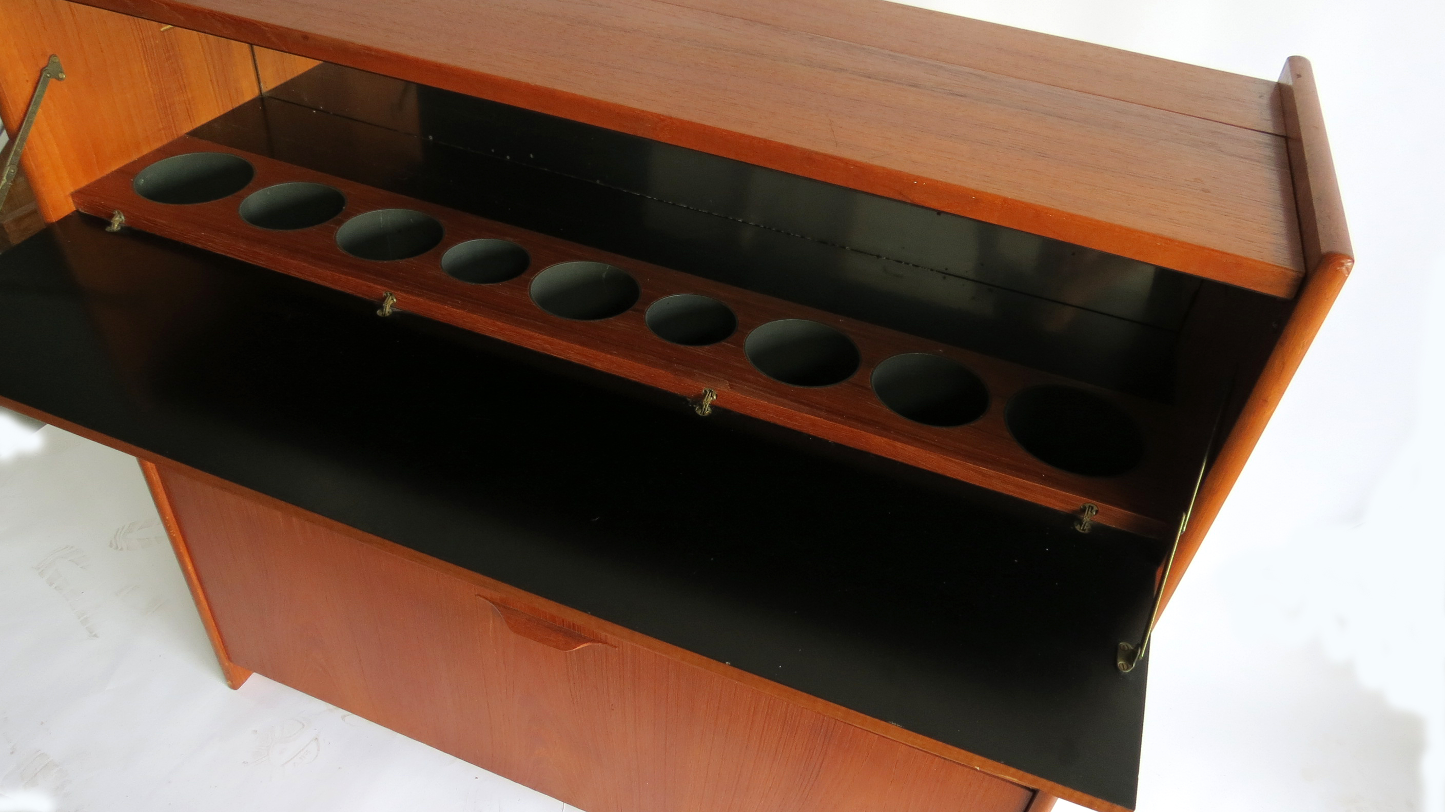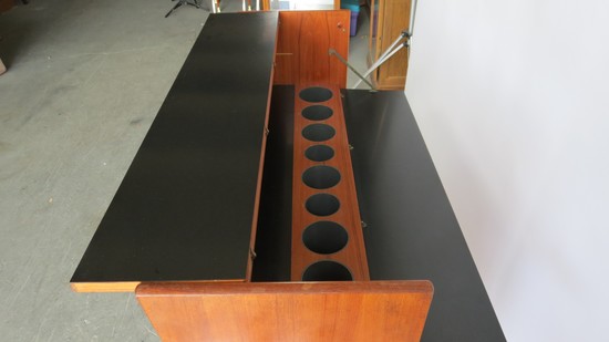 Johannes Andersen (1905-1991) designed this teak wood standing dry bar for Skaaning and Son in 1961. The front of the bar features inlaid circles of rosewood and a chrome foot rail. The bartender side of the bar has a fold out top, which folds out for a black composition serving area. The back folds down with a black preparation area and a nine glass holder and a mirrored back. A sliding shelf door covers spaces for storing supplies and the bottom rotates down to store nine bottles. The bar, so useful when open, close up to a compact 45" wide, 43 1/2" high and 15" deep when not in use.
