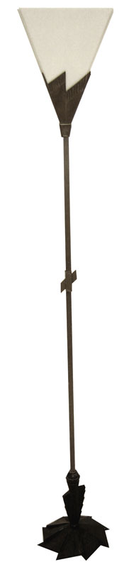 This American art deco wrought iron floor lamp was designed and made by John B. Salterini (? - 1952) in the 1920’s. The lamp shaft and base in gold and blackened iron rises from a geometric base to a shade of four milk glass panels which conceal the bulb. The lamp has been rewired and is 66 ½” high.