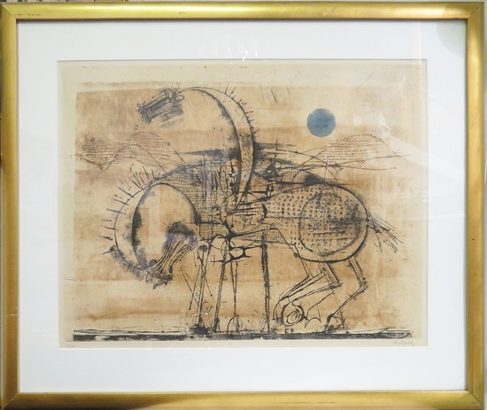 Johnny Friedlaender was a fabulous artist who worked during the height of the Modernist movement in Europe. This etching and aquatint is quite rare, only 100 exemplars were printed. This one is numbered on the lower left "53/100" and is signed "Friedlaender" in pencil on the lower right. Shows a Trojan horse patiently waiting underneath a blue moon. It is framed in UV Plexiglas and acid free materials. The frame is gold leaf. Plate Size 17" x 23" Overall: 26" x 31"