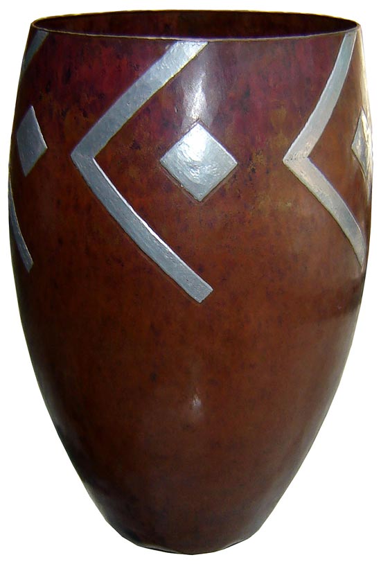 This French art deco hand hammered dinandere vase is from the 1930’s and is made of copper with an inlaid decoration of silver diamonds and chevrons. The vase stands at 7-7/8” high and is signed “Jan Joulin”. It is also marked “31-G”.