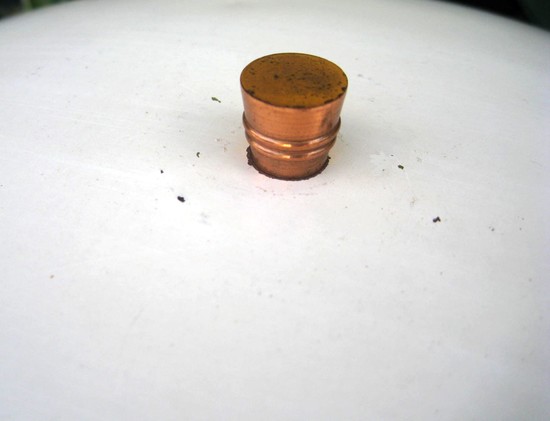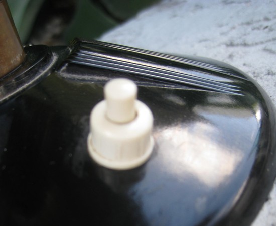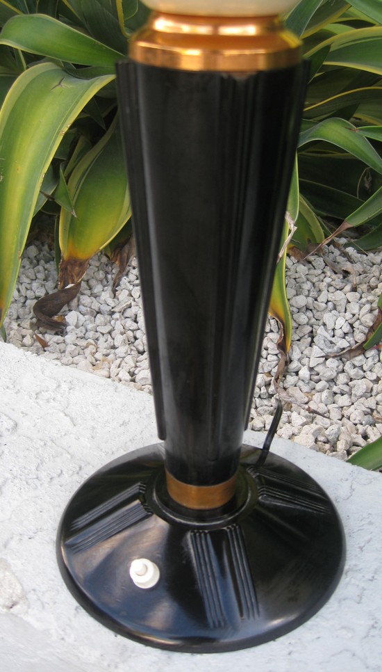 This French art deco table lamp was made by the Paris, France firm Jumo in the 1940’s. The black Bakelite base has five sets of three raised lines as décor and a white plastic switch. The black Bakelite shaft starts with a round cylinder and then spreads upward with raised wings. The metal shade and cup are in cream lacquer. A copper ring separates the base and the shaft, a copper fitting holds the cup and a copper finial is on the top. The lamp, which is 18” high and 17” in diameter is in good original condition, except for being rewired for US electricity.