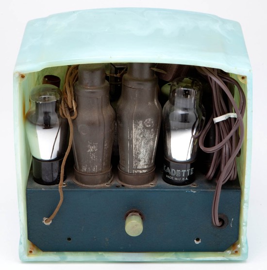 This incredible marbleized turquoise blue 1937 radio is made of catalin (a phenolic resin often incorrectly called Bakelite which is a brand name). The radio was manufactured by the Kadette Radio Corporation, Ann Arbor, Michigan and is known as the Kadette “Clockette” model K24. It features a brass dial face, matching knobs and its original decal. The radio is 8” tall, 8” wide and 5” deep and has been cosmetically restored/repaired to its original condition.