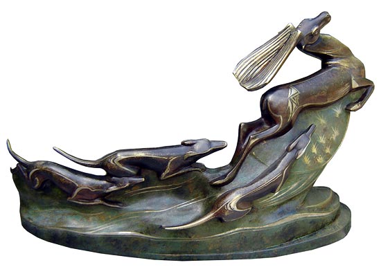 A wonderful and rare French art deco bronze by Alexandre Kelety. Cubistic yet fluid and full of dynamic spirit, the figural group depicts three dogs chasing a stag. Silver inlay highlights the hounds and deer, as well as speed lines and also picks out the grass under the stag. The deer and dogs are in brown patina, the background is in green patina. The bronze is signed “Kelety”, has two foundry seals and measures 19” wide, 11-3/4” high and is 5” deep.