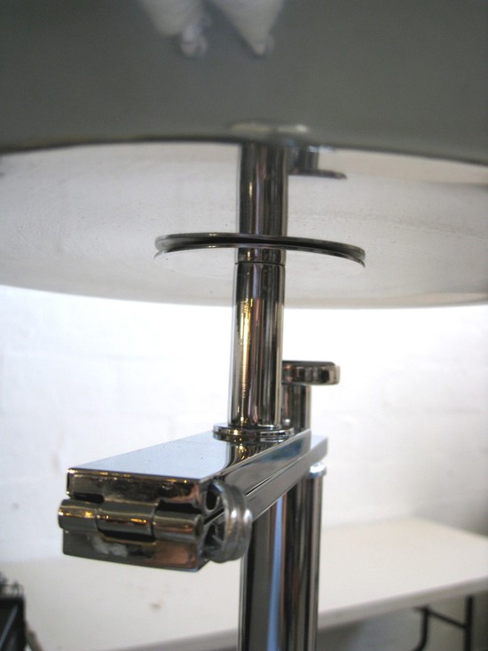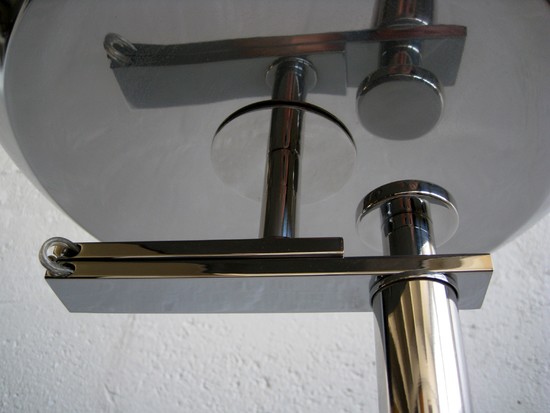 Kurt Versen (1901 - 1997) designed this American art deco aluminum and chrome floor lamp in the 1930’s. The lamp performs two functions; with the bowl up it is a torchiere, flip the bowl down and it is an excellent reading light, with Versen’s signature offset standard on the base. The lamp is 62" high as a torchiere, and 56 ½" high as a reading lamp. The fixture has been rewired, the metal polished and clear lacquered to protect it.