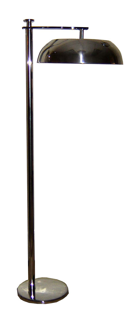 This American art deco floor lamp/torchiere was designed by Kurt Versen (1889 – 1943) dates from the 1930’s and performs the function of two lamps. The top bowl flips down for use as a reading light. The light is of polished aluminum protected by clear lacquer. With Versen’s signature offset standard on base, the lamp measures 62” high as a torchiere and 56 ½” high as a reading lamp.
