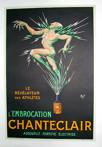A French art deco poster for L'Embrocation Chanteclair, a body lotion advertised as a developer of athletes. Against a black background an athlete springs from a jar containing the product, electricity radiating from his body. The poster is signed "Mitch" (Michel Liebaux 1881 - 1923) and measures 23 1/2" x 16". Published by Publicite Wall, paris.