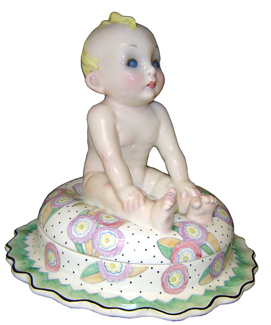 A large Italian Art Deco box that dates from the 1930s. This ceramic box by Lenci of Torino, Italy is hand painted with a cute baby atop. Measuring 8” in diameter and 8-1/2” high, the box is signed on the bottom “Lenci, Made in Italy, Torino – 10-XI, Ne.”.
