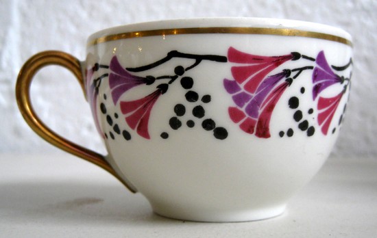 This French art deco very geometric tea set dates from the 1930’s and is marked “Limoges”. Decorated in a magenta and violet stylized Morning Glory design, the set consists of a large tea pot, sugar bowl, cream pitcher, eight cups, eight saucers and eight cake plates. The handles, spouts and knobs are gilded. The tea pot measures 10” high.