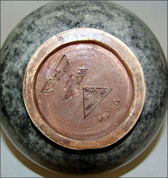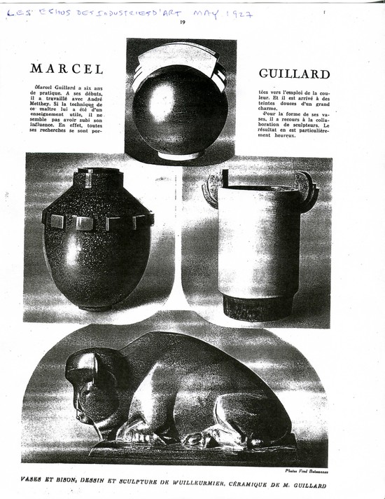 This striking geometrically inspired French art deco glazed stoneware vase was designed ca. 1927 by Marcel Guillard (1896 - 1932), executed by Willy Willeumier and edited by Editions Etling in Paris. The vase measures 9" high and the stepped geometric top is in a pale peach craqueleure glaze while the spherical body is a washed grey with touches of peach. The vase is marked "Marcel Guillard", "Editions Etling Paris", "Willeumier" and "France. The vase is pictured in the May 1927 issue of "Les Echos des Industries D'Art".