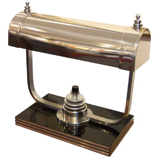 This American art deco desk lamp from the 1930s was manufactured by the Markel Company of Buffalo, New York. The rectangular black composition base is highlighted by "speed" stripes. The nickel plated pivoting shade supports finials and stepped up light switch all speak of the period's fascination with the machine. The lamp has been rewired. It measures 11" high and 12" wide.