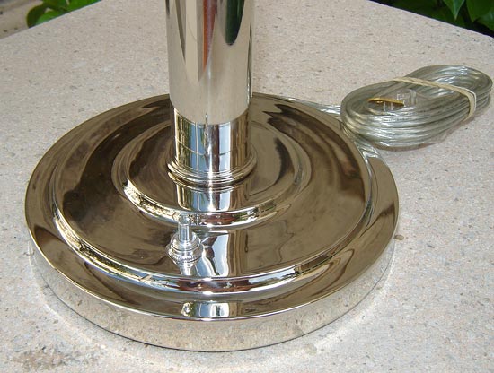 This American art deco table lamp was designed and produced in the 1930s by the Markel Company of Buffalo, New York. The three “speed” rings on the shaft are echoed in the typical Markel finial. This is the largest and most impressive of the Markel table lamps. The lamp has been replated in bright nickel and rewired. It measures 18” high and 15” in diameter.