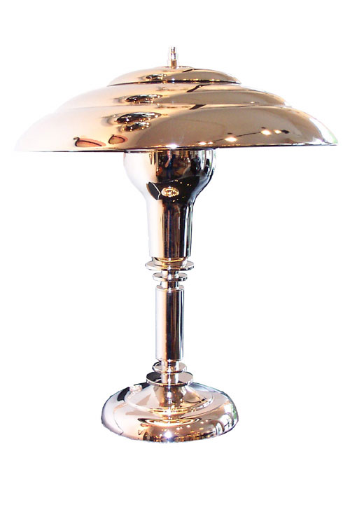 Another wonderful design by the Markel Corporation. This American art deco lamp is from the 1930s and features a series of speed rings on the shaft. The lamp has been replated in bright nickel and rewired. It measures 16" high.