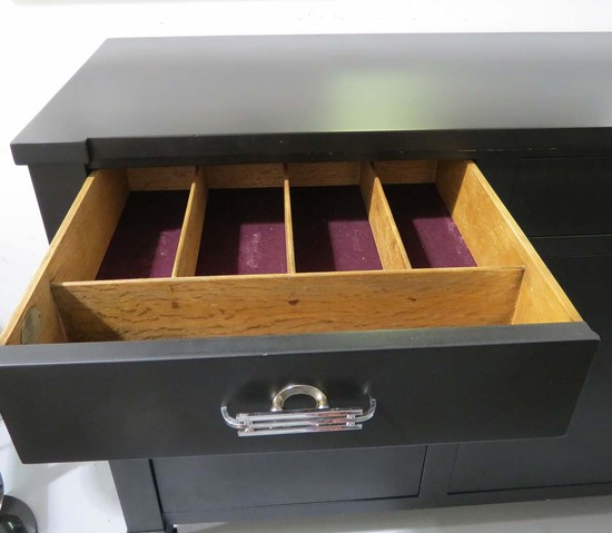 This very streamline 1960's sideboard was manufactured by the Baker Furniture Company. The sideboard has been refinished in black mat enamel and the handles are American Art Deco at its best! It has three drawers (one with felt bottom and divisions for flatware) and three doors with shelves behind each door. The sideboard is 34 1/4" high x 64 1/4" wide and 19" deep.