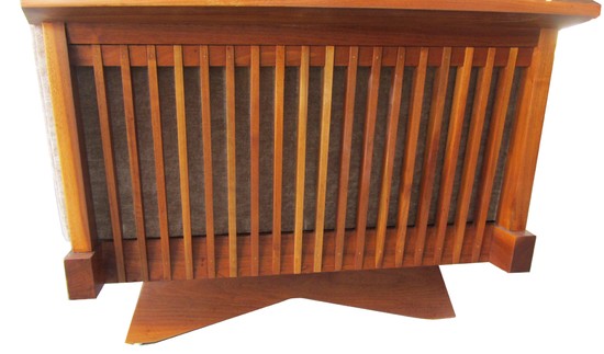 This Mid-Century Modern design long spindle side sofa was designed ca. 1950 by George Nakashima (1905-1990) for his Origins line, produced by the Widdicomb Furniture Company, Grand Rapids, Michigan. The sofa, number 252 W in solid walnut, is in excellent condition and has been recently recovered. The sofa is in two sections for portability and for possible use with a table for around a corner. It is 125" wide, 34" deep and 25" high at the back.