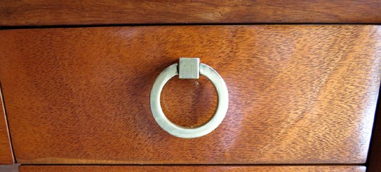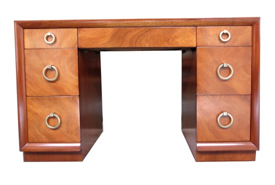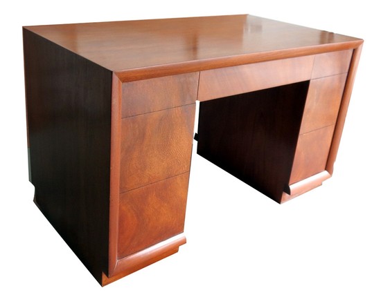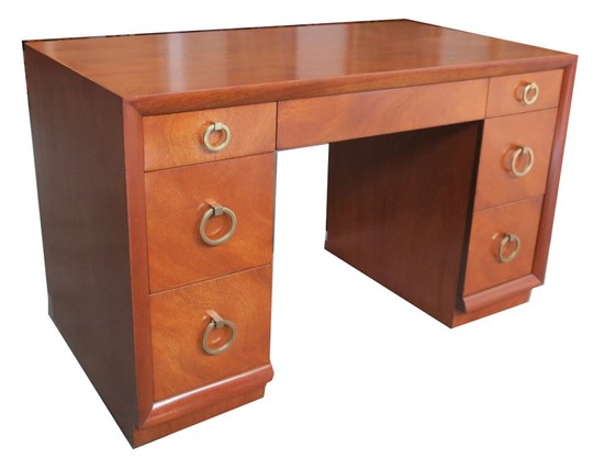 T.H. (Terence Harold) Robsjohn-Gibbings (1905 – 1976) was born in London, England and emigrated to America in 1936, working as a designer for the Widdicomb Furniture Company from 1943 to 1956. It was for Widdicomb that he designed this desk, Model 317, in the early 1940’s. The desk features solid oak secondary woods and dovetail joints on the drawer fronts. The figured walnut body has been restored to original showroom condition and the brass pulls have been hand polished and coated with clear lacquer to prevent oxidation. The middle drawer has a label that reads “Modern Original, Widdicomb”. It is 29 ¾” high, 48” wide and 26” deep. The knee hole is 24 ¼” high. The desk can be freestanding as the back is also finished in figured walnut.
