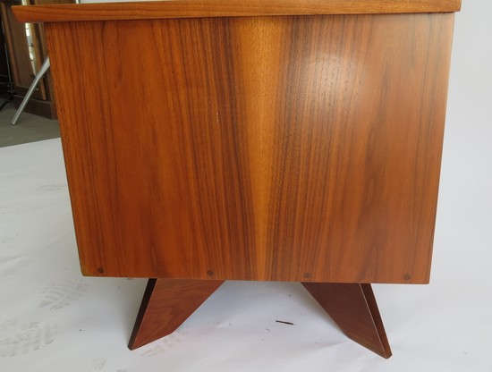 George Nakashima was born in Spokane, Washington in 1905. A sculptor, architect and woodworker he graduated from M.I.T. with a master's in Architecture in 1930. Nakashima wrote a book describing his experiences and relationship with wood, The Soul of a Tree (1981). In 1983, he designed the impressive “Altar of Peace” installed in the Cathedral of St. John the Divine in New York City. He designed the ORIGINS line for the Widdicomb Furniture Company in Grand Rapids, Michigan and supervised the production of the line. Each piece was marked with his name and dated.