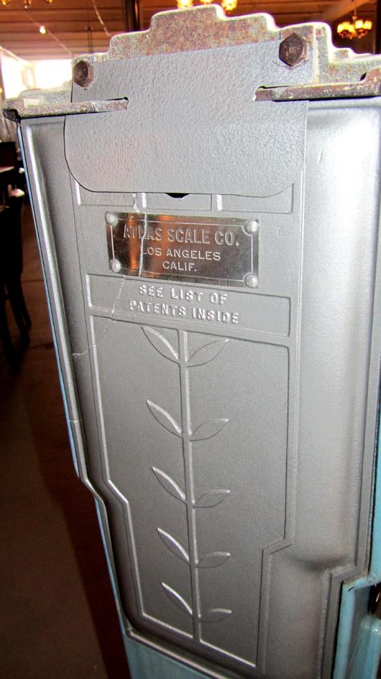This American art deco penny scale was produced by the Mills Industries of Chicago ca. 1935. In baby blue and white enamel on a cast iron body, the scale has geometric detailing that typifies the era. The enamel is flawless and the chrome coin receptacle and the rails are bright and shiney. The scale is 36” high, 18” wide and 24” deep.