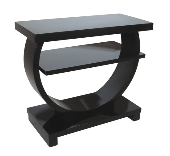 This American art deco black lacquer end table was made and retailed by Modernage Furniture Company in New York City. They proclaimed themselves in the 1930’s as “the largest modern furniture store in America”. The table is 12” wide, 25” long and 22” high. The table has been refinished and is in excellent condition. This is the shorter version of the table.