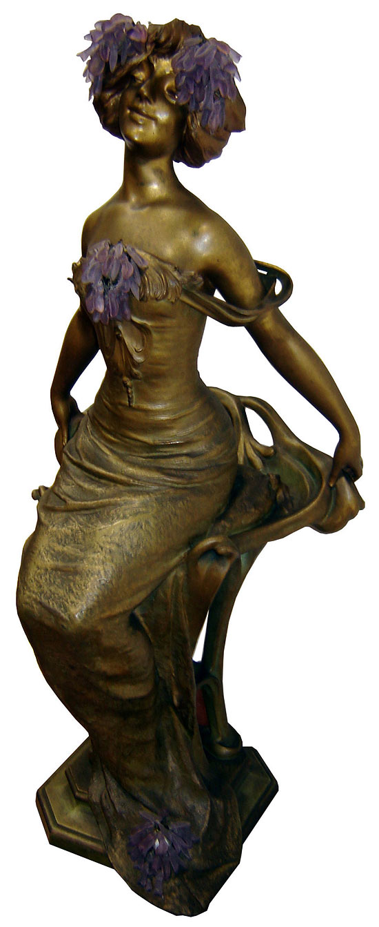 A large French art nouveau illuminated bronze sculpture by Lucien Aliot (1877 – 1956). The young lady is sitting on a turn of the century chair, her hands holding onto the chair back. Lights in her hair and her dress are covered with lavender glass beads. The bronze is “37 ½” high and has been rewired for American electricity.