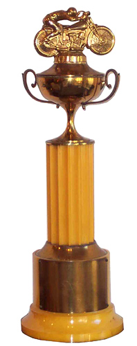 An extremely rare find, this art deco motorcycle trophy is made of solid bakelite and a copper colored metal. The 22" high trophy was apparently never awarded as the face plate is blank.