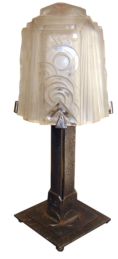 This French wrought iron table lamp dates from the 1930’s. The geometric frosted glass shade is signed “Muller FreresMuller Freres