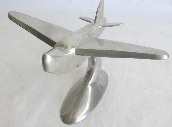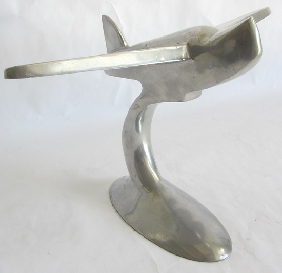 This model of a Navy PBY Catalina patrol bomber was machined from a solid block of aluminum. The PBY was introduced in 1936 and produced until 1945. The model stands as a unique piece of sculpture with its streamline base, squared off wings and absence of motors, it is definitely not a realistic model but it captures the essence and spirit of the airplane. The model is 9” high, 12 ½” wide and 9” long. The base is 3”x 7”.