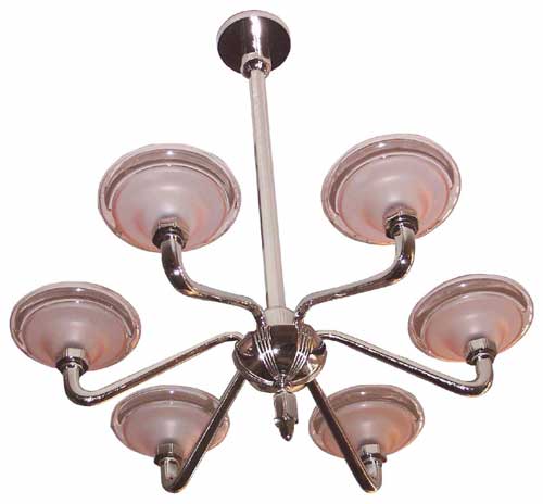 This French 1930s art deco chandelier features a nickel plated body with six swooping arms, each supporting a frosted pink to clear glass bowl. The chandelier has been replated and rewired and is ready to hang in your home. It measures 30" in diameter and has a 35" drop which can be shortened if desired.