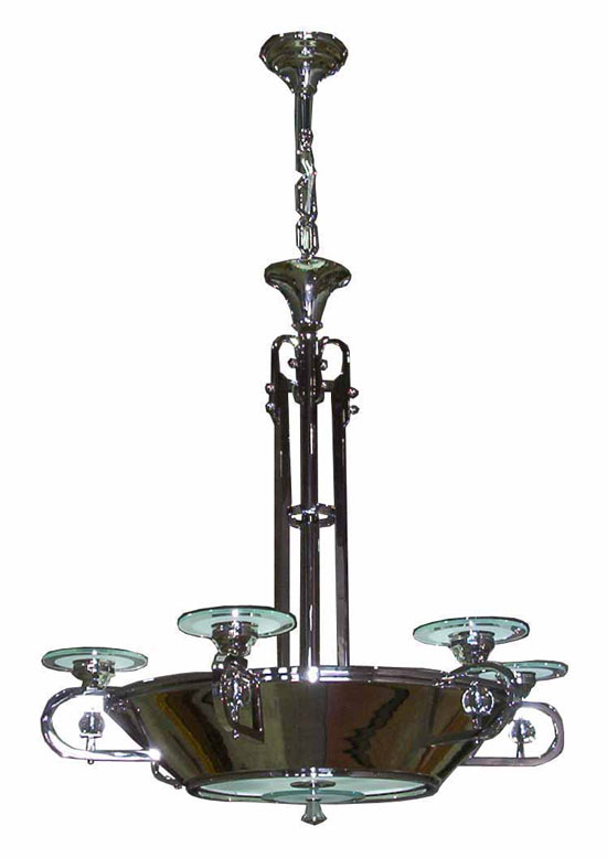 This impressive French art deco chandelier dates from the 1930’s and is finished in bright nickel. The intricate central shaft features a two stage ceiling cap and a geometric “waterfall” lower body. The central bowl supports six illuminated discs on curved supports with a centered glass ball. The bottom of the bowl is a clear & frosted circle of glass with a suspended smaller circle. This large (47” drop, 32” diameter) chandelier has been replated and rewired for American electricity.