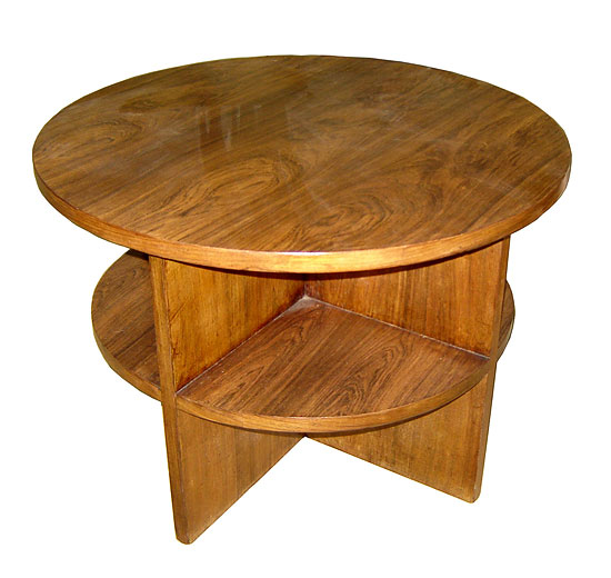 This French Art Deco occasional table has veneers of an exotic figured wood. The round top sits on four slab legs which separate the four pie shaped lower shelves. The table measures 27-1/2” in diameter and is 20” high.
