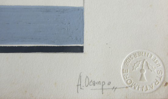 This American art deco pen, ink and gouache drawing was done in 1937 by Alfredo Ocampo of 208 Pearl Street, Brooklyn, New York. It is signed, away from the image, and in pencil "A. Ocampo". The drawing shows a sleek luxury automobile in front of a very art deco building with "Automobile Show" above and "1937" below. The image is 12 3/8" x 7 ½", the paper is 14 ½" x 11 3/8". We know nothing about Ocampo except he worked at Bethlehem Steel during the war years.