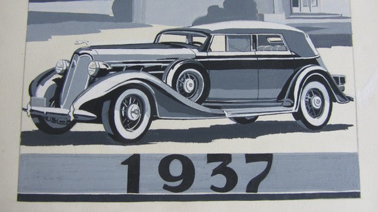 Original American Art Deco Pen and Ink Drawing with Gouache 1937 Automobile